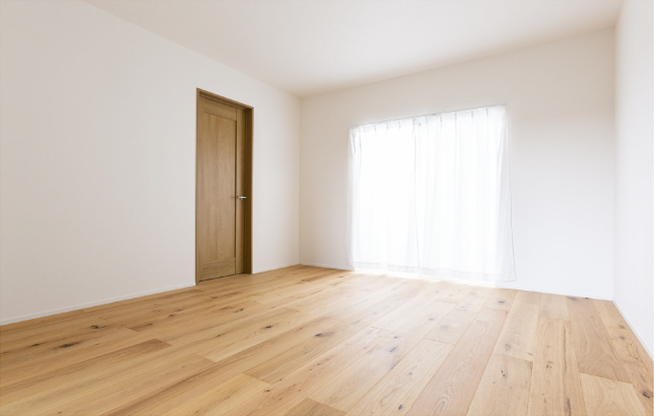 濃いめのフローリングと壁板を基調とした、落ち着きのある空間。
