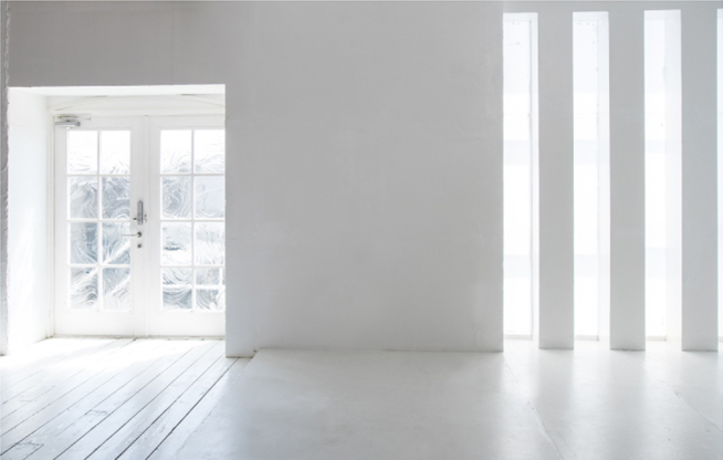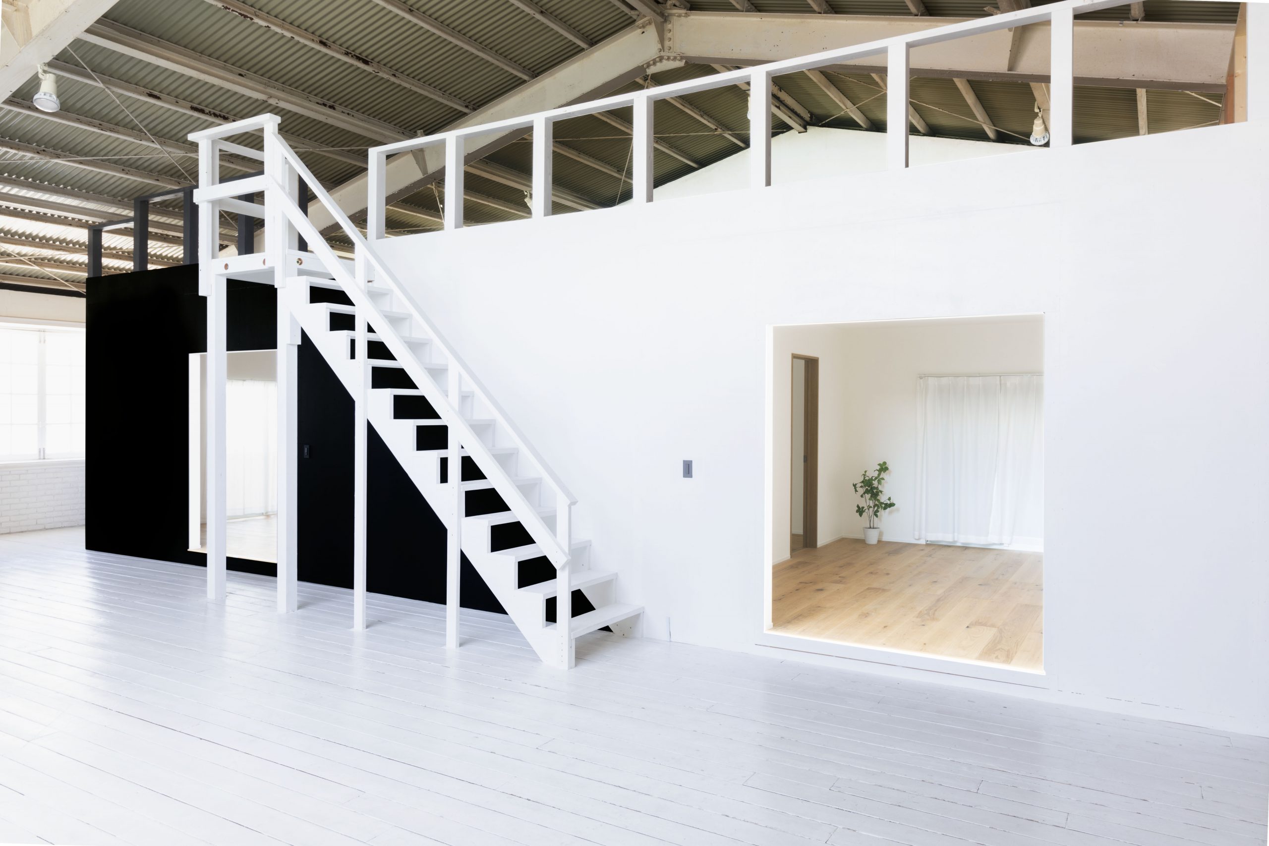 真っ白な壁・フローリング・階段の自然光が差し込む空間デザイン。